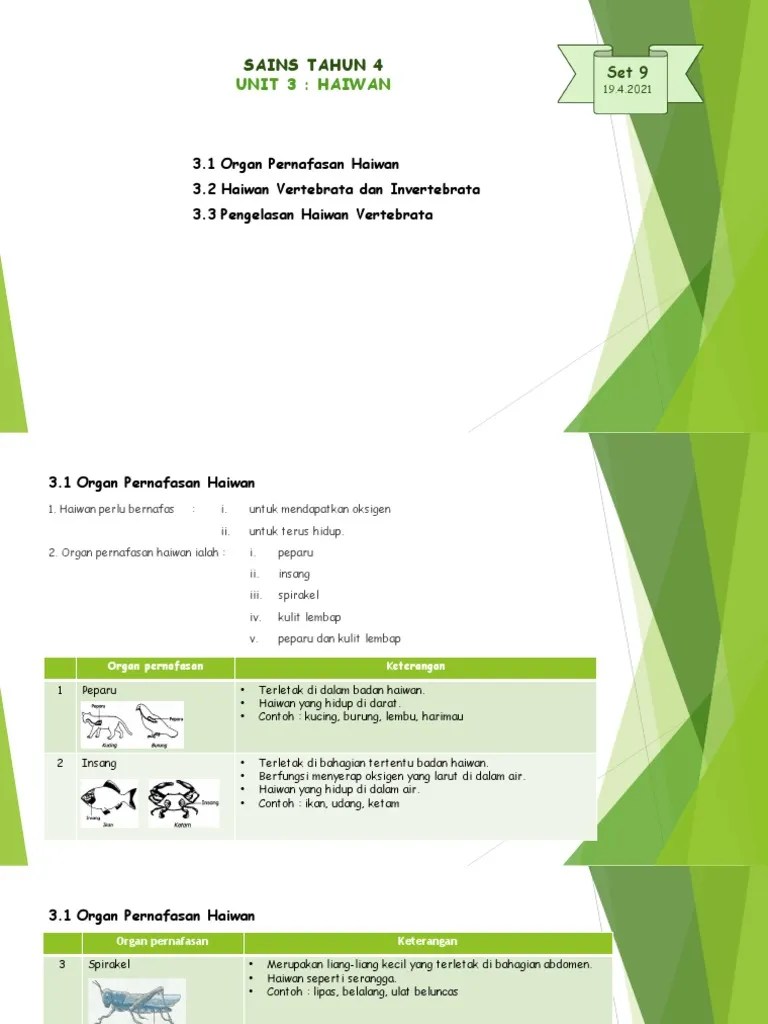 3.1.1 pengelasan haiwan berdasarkan organ pernafasan · 3.1.2 hidup di darat dan di air · 3.2.1 haiwan vertebrata dan haiwan invertebrata · 3.2.